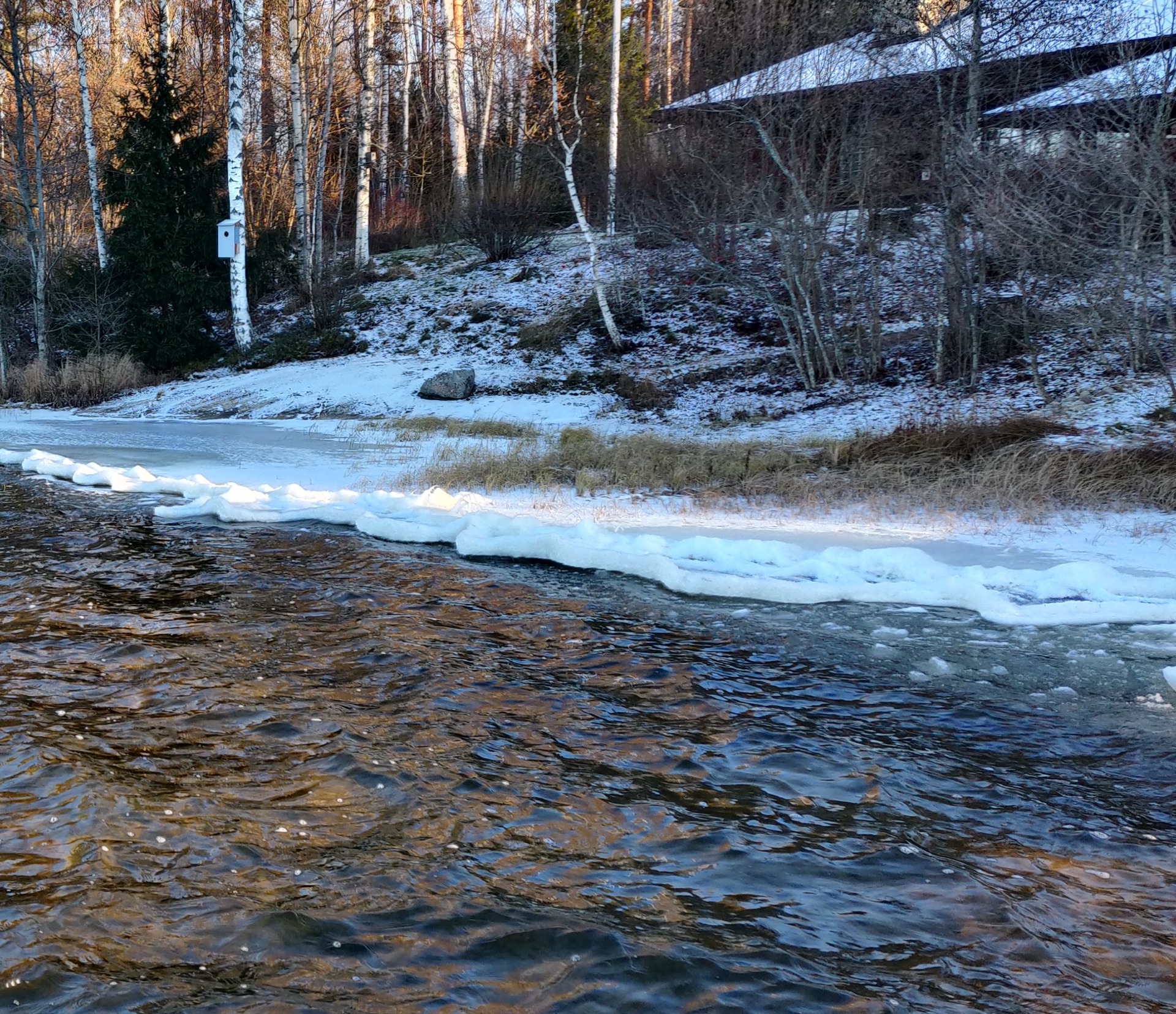 Kuva on otettu äsken (1.12.21 klo 13.00) Kontolanniemestä. Jääsohjoa on pari metriä rannasta, tuuli Forecan mukaan luoteesta 4 m/s ja pakkasta reilut puolenkymmentä astetta. Kaveri oli mitannut pari päivää sitten Puujärven veden lämpötilaksi metrin syvyydessä yhden Celsius asteen.